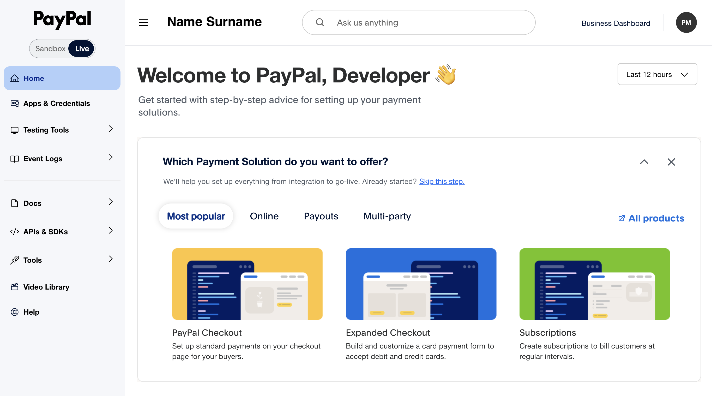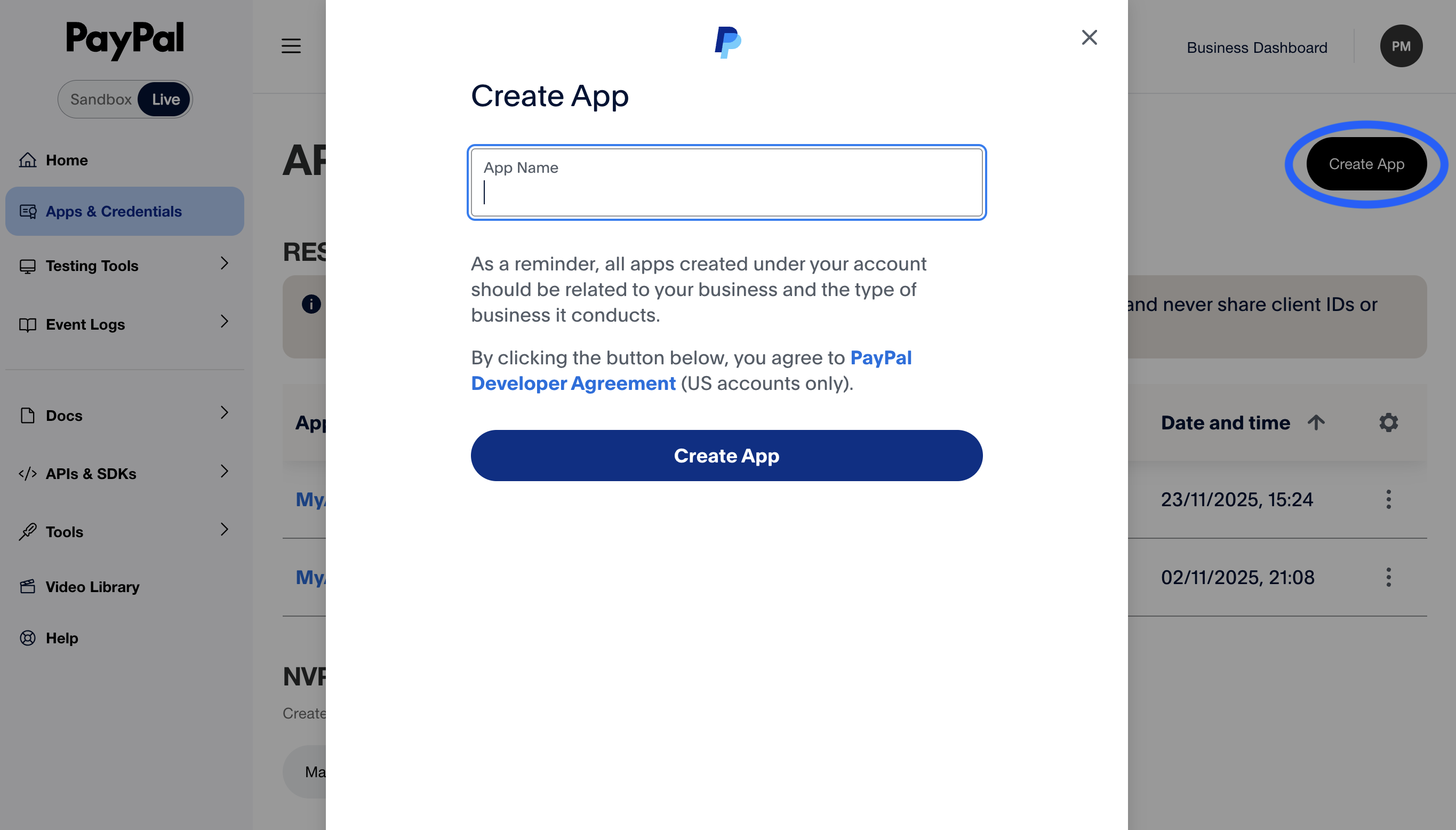 Log in to PayPal Developer Dashboard