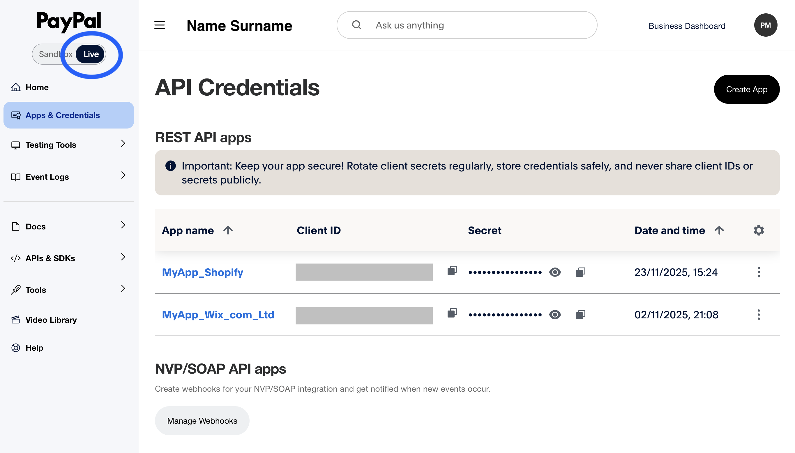 Click Apps & Credentials in the sidebar. Make sure you're on the Live tab (not Sandbox).