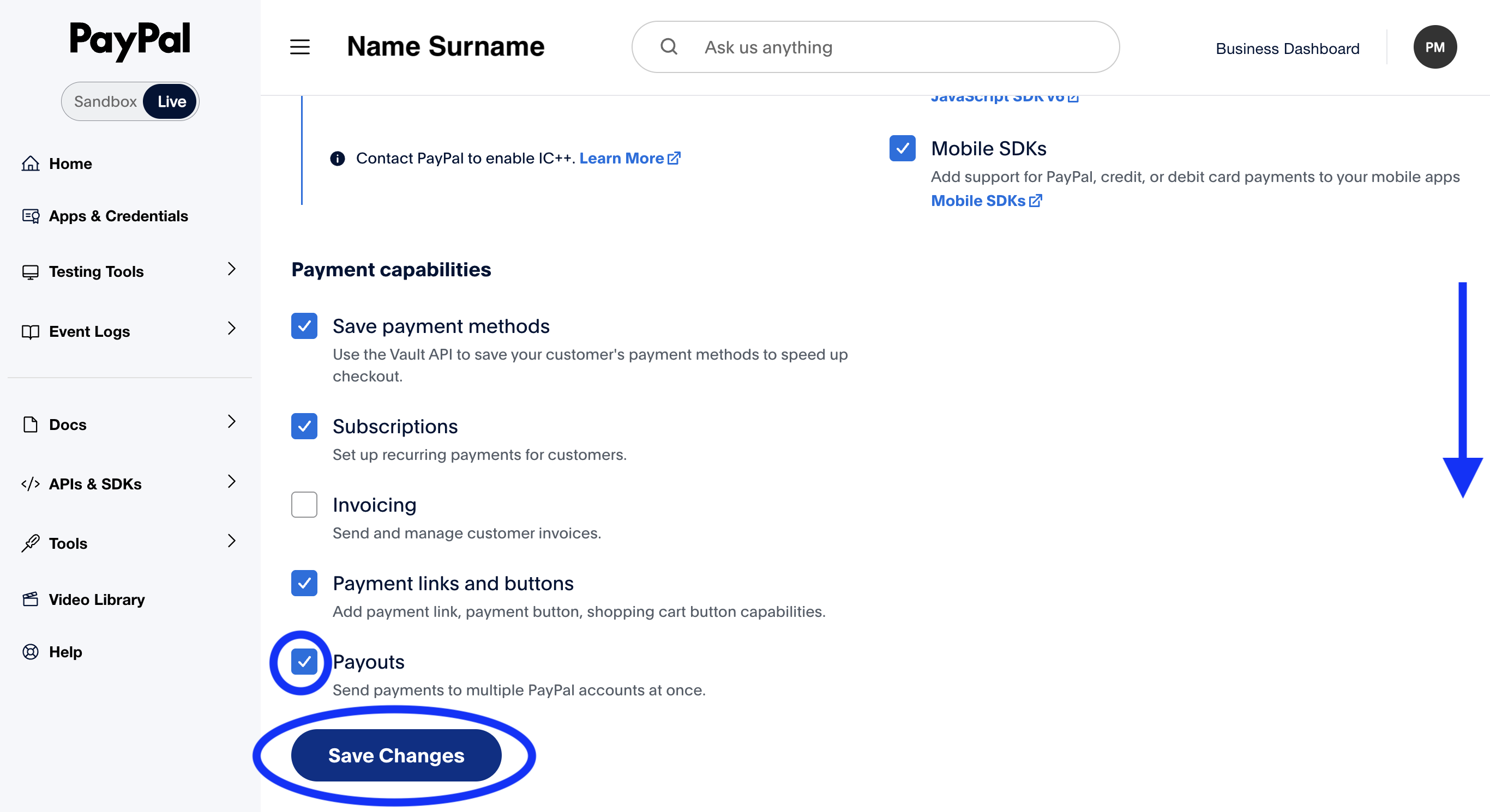 Scroll down to the Features section. Make sure Payouts is checked. If it's not available, you may need to contact PayPal support to enable it on your account.