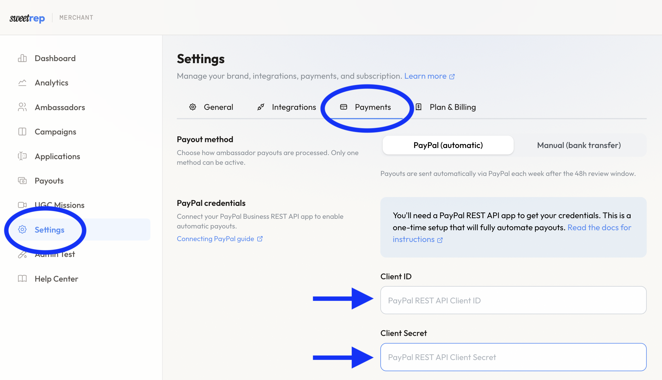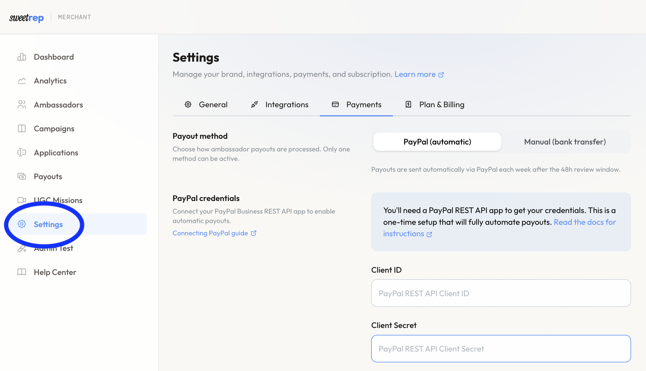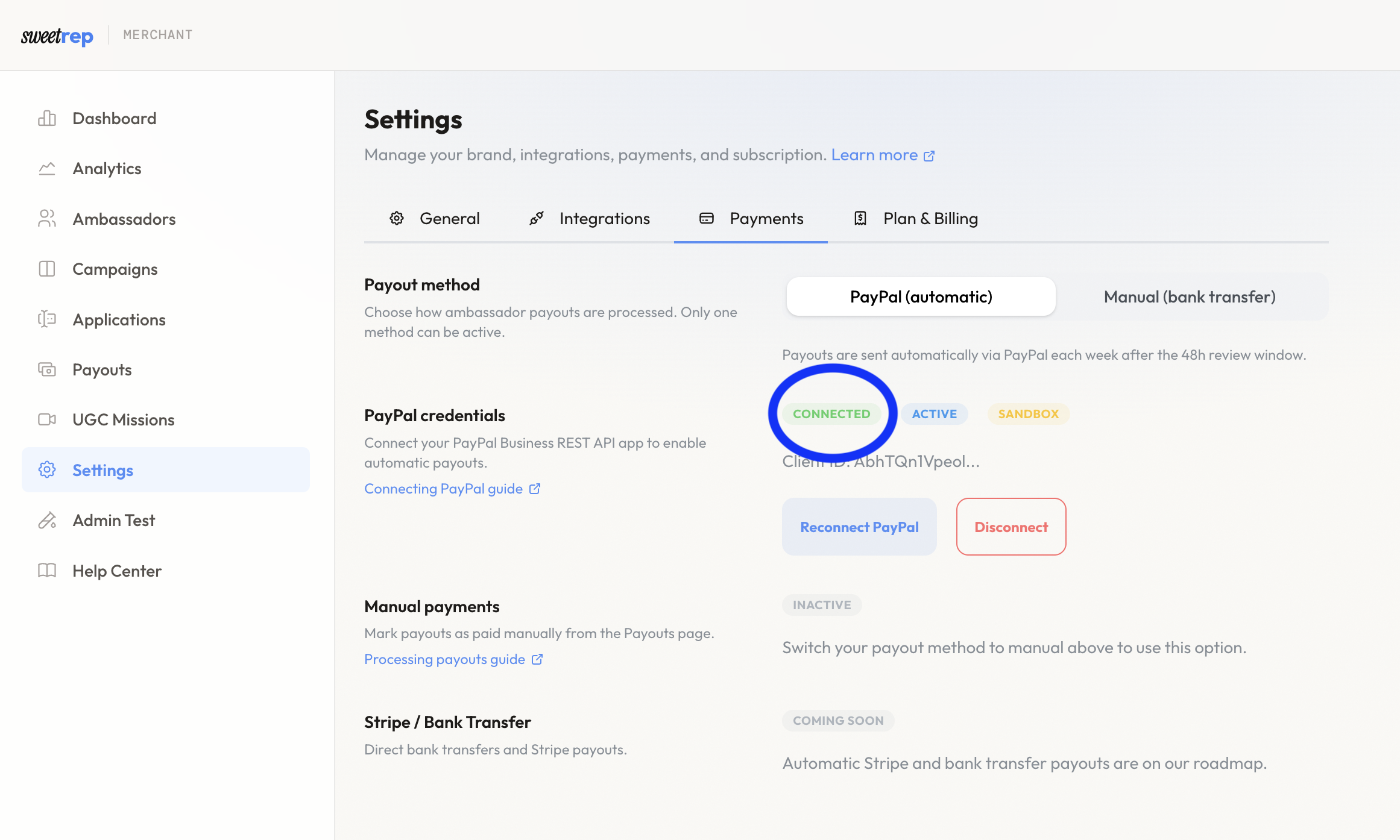 To send automated payouts to your ambassadors, connect your PayPal Business account to SweetRep.